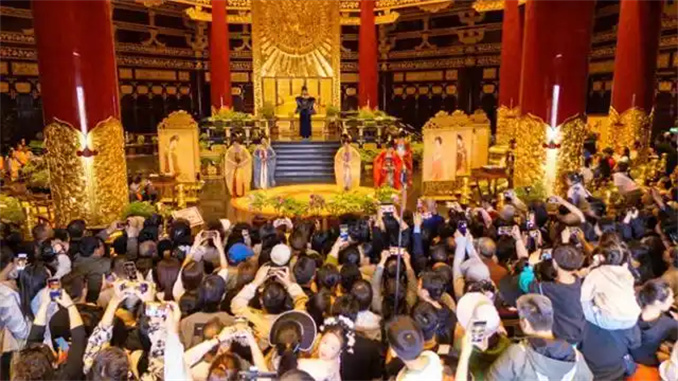 全天127場國風(fēng)常態(tài)演出輪番上演。5月1日至4日期間,《天門報時》《天門迎賓禮》拉開應(yīng)天門國風(fēng)演出序幕,身著華麗服飾的禮官、侍女在應(yīng)天門南廣場列隊而立,儀仗威嚴(yán),旌旗獵獵!赌奚延鹨隆穼⒃趹(yīng)天門序廳上演,舞者們輕盈躍動、身姿優(yōu)美,將古代宴會的氛圍表現(xiàn)得淋漓盡致。