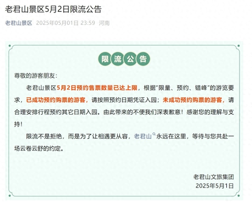 5月1日,老君山景區(qū)發(fā)布限流公告: