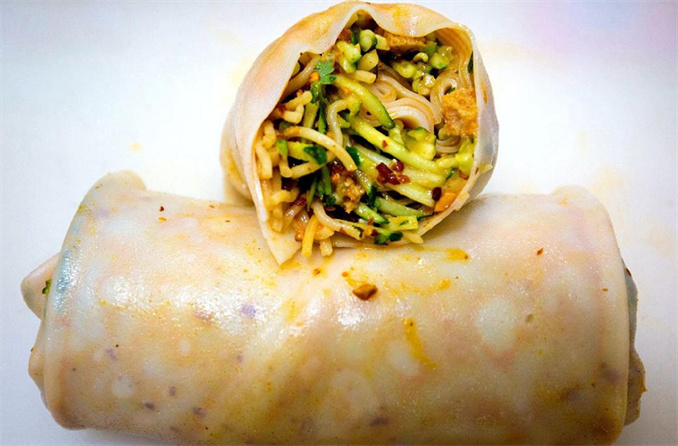 河南人發(fā)明的涼皮taco!黃瓜絲與面筋在透亮涼皮里玩疊疊樂,秘訣是讓老板多加芝麻醬,一口咬出彩虹層,堪稱夏日里的解暑神器!