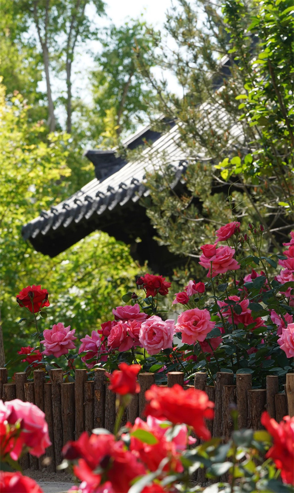仿宋建筑與月季花海相映成趣,穿一襲漢服漫步其中,仿佛穿越千年。