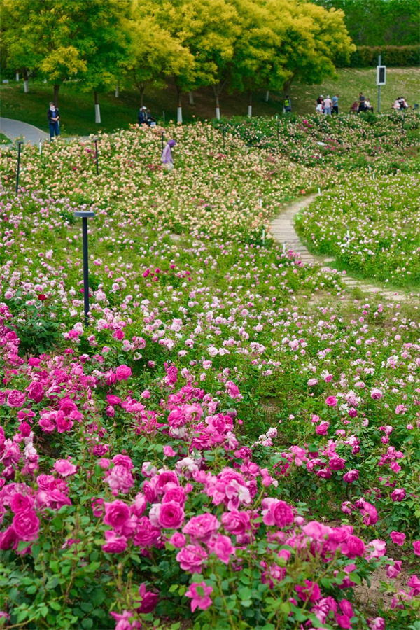 150畝月季花海,70余個(gè)品種、近五十萬(wàn)株月季競(jìng)相綻放,下沉式月季花海與周邊的大型月季花架相映成趣。