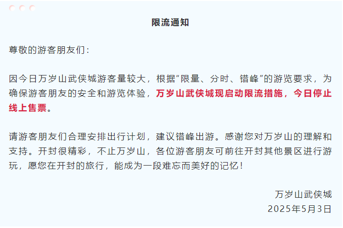 您的當(dāng)前位置:網(wǎng)站首頁 > 出行資訊 > >開封萬歲山啟動限流措施,今日停止線上售票