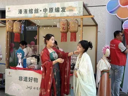 漫步阜民里主會場,城市更新帶來的潮流時尚與文化體驗在這里交織交匯,來自全市各縣區(qū)的非遺傳承人將雕刻塑造工藝帶到這里,共同組成了一個展示金石之美、器物之趣的立體美學空間。在以紡織類非遺技藝為主題的街區(qū)上,市民游客在這里感受傳統(tǒng)香包與繩結藝術的精妙,有的游客將長發(fā)盤起,嘗試傳統(tǒng)妝造;有的對鄭州刺繡文創(chuàng)熱愛不已,上前選購留念。