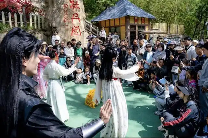 玉箏一響,武俠DNA動了。身著古裝的俠客們在山水間翩然起舞,劍氣與云霧交織,引得游客紛紛駐足。