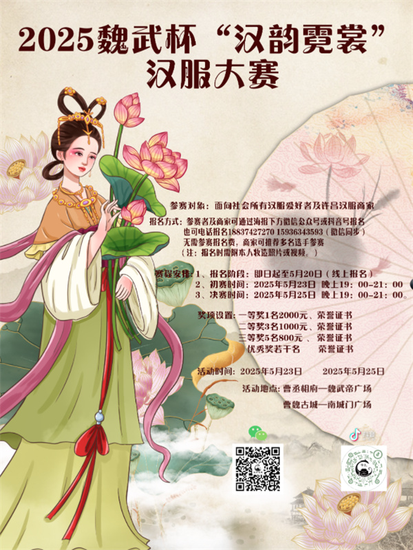 許昌市魏都區(qū)文化廣電和旅游局、魏都區(qū)文旅文創(chuàng)中心定于2025年5月,在曹魏古城南城門廣場、曹丞相府魏武帝廣場舉辦2025年魏都區(qū)第二屆“漢韻霓裳”漢服大賽活動。