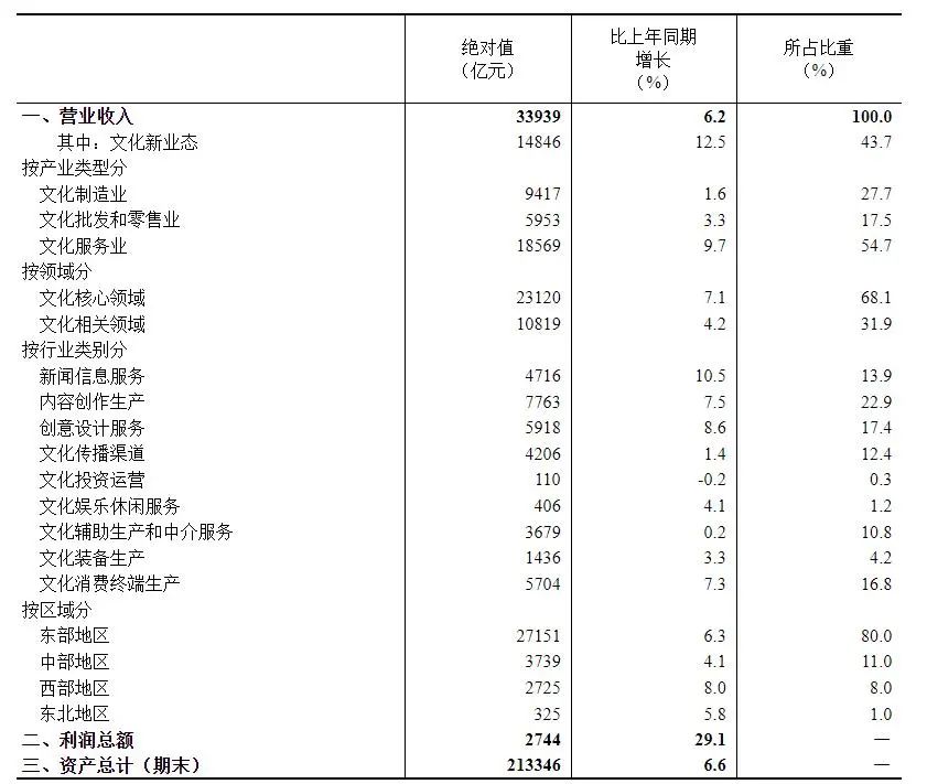 近日,據(jù)國家統(tǒng)計(jì)局官方網(wǎng)站消息,據(jù)對(duì)全國8.0萬家規(guī)模以上文化及相關(guān)產(chǎn)業(yè)企業(yè)(簡稱“文化企業(yè)”)調(diào)查,2025年一季度,文化企業(yè)實(shí)現(xiàn)營業(yè)收入33939億元,按可比口徑計(jì)算,比上年同期增長6.2%。其中,文化新業(yè)態(tài)特征較為明顯的16個(gè)行業(yè)小類實(shí)現(xiàn)營業(yè)收入14846億元,比上年同期增長12.5%,快于全部規(guī)模以上文化企業(yè)6.3個(gè)百分點(diǎn)。