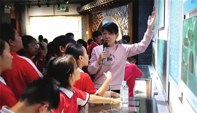 景區(qū)工作人員向研學(xué)學(xué)生講解“三蘇”生平事跡。
