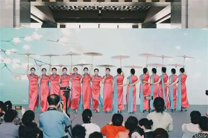上午9時(shí)30分,全體人員齊唱國歌,活動(dòng)在激昂的旋律中啟幕。隨后,朗誦《讀中國》與旗袍秀《書畫中國》聯(lián)袂登場(chǎng),模特們手持水墨長(zhǎng)卷,以旗袍為“移動(dòng)畫布”,將《千里江山圖》的青綠山水與《清明上河圖》的市井煙火化作步履間的詩行,贏得滿堂掌聲。