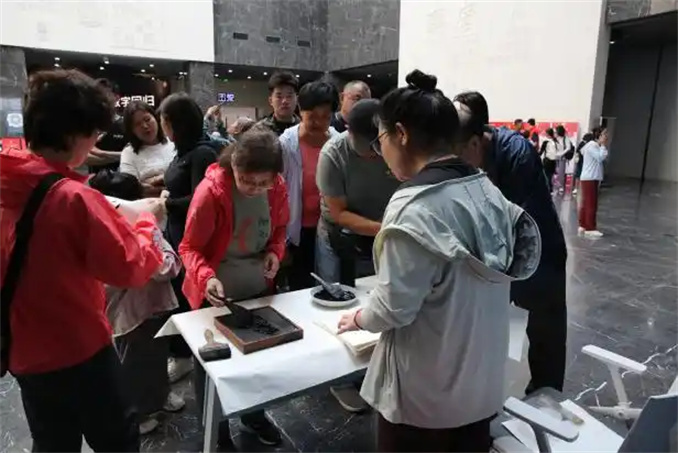 體驗豐富多彩。在宣文館的“拾趣方塊字”青少年互動體驗展廳中,小朋友用稚嫩的小手書寫古老的甲骨文字,用甲骨文元素設(shè)計屬于自己的甲骨文書簽。“傳拓古今・瓦當(dāng)新承”不僅讓小朋友們了解了瓦當(dāng)上的文字內(nèi)容和美學(xué)含義,并且小朋友們還在社教老師的帶領(lǐng)下參觀《開成石經(jīng)》拓片展,更讓小朋友們驚喜的是可以來到中國文字博物館的文物拓印工作室和文物保管員學(xué)習(xí)如何進(jìn)行拓印。同時,字博印社推出的“甲骨文水滸 108 將”主題印章吸引眾多印章愛好者來此打卡;非遺體驗活動雕版印刷吸引了大批觀眾,他們親手操作傳統(tǒng)雕版印刷術(shù),感受古代印刷工藝,古樸的甲骨文字與傳統(tǒng)印刷相結(jié)合,令人感慨中華文明傳承的智慧與創(chuàng)新活力。