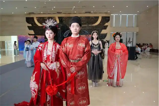 禮儀之大,服章之美,謂之華夏。在悠悠樂鳴聲中,“商王”王袍加身,威嚴(yán)沉穩(wěn);“王后”華服錦繡,端莊大氣;“貴族們”身著精致,優(yōu)雅從容;“侍女們”素雅麻衣,簡約質(zhì)樸……衣袂翻飛間,將古老文明的風(fēng)華娓娓道來。觀眾透過精心復(fù)原的服飾與生動直觀的演繹,一睹商代眾生百相。古樂繚繞間,時(shí)光的年輪流轉(zhuǎn)至唐宋時(shí)期,身著不同朝代服飾的青年依次登場,沉淀千年的文脈在古都鄭州的“城市文化會客廳”汩汩流淌,年輕一代傳承文化薪火的使命自覺,也在此刻化為具象。