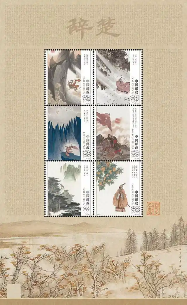 此次發(fā)行的《楚辭》特種郵票一套6枚,由高云設(shè)計,李金薇編輯,每一枚都選取《楚辭》中的經(jīng)典詩句,郵票畫面采用中國傳統(tǒng)繪畫的表現(xiàn)形式,將經(jīng)典語言與當(dāng)代審美相融合,構(gòu)圖舒適,虛實相間,意境崇高,以“黑紅主色調(diào)”彰顯楚文化的厚重與熾烈,圖案中隱含的楚地紋飾與丹江山水意象,正是對淅川作為“楚風(fēng)漢韻交匯地”的藝術(shù)化表達(dá)。
