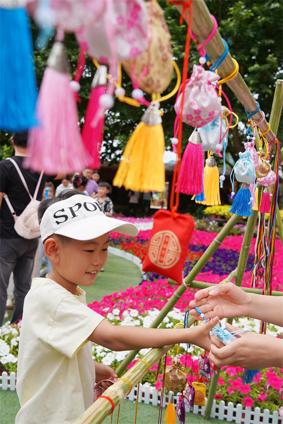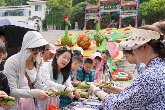 趣味互動(dòng)活動(dòng)中,巨型“槲包飛行棋”妙趣橫生,化身“人形棋子”的游客將在蹦跳闖關(guān)中收集“小妖幣”,兌換用槲葉包裹的特色香粽或端午蛋。更有歡樂釣槲包、好運(yùn)射五毒、端午好彩頭等游戲,讓傳統(tǒng)習(xí)俗煥發(fā)潮玩魅力。