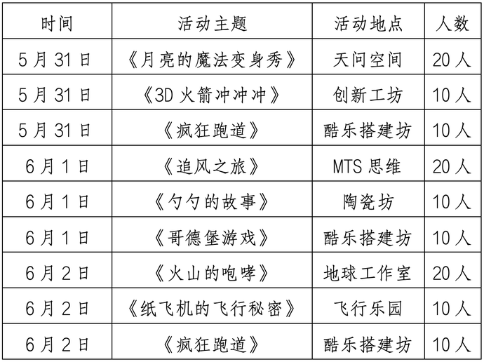 除前四項(xiàng)無需報(bào)名的活動外,鄭州科技館五層“展品研發(fā)中心”【共享空間】和“科學(xué)工作室”還開展有兩項(xiàng)限額體驗(yàn)活動:《創(chuàng)意小船,粽葉變身科學(xué)奇跡》和《科學(xué)過端午,童心慶六一》。市民朋友須提前十分鐘前往五層科學(xué)工作室服務(wù)臺進(jìn)行活動報(bào)名。每場活動開始后,停止進(jìn)場;顒尤藬(shù)滿額時會提前開始。