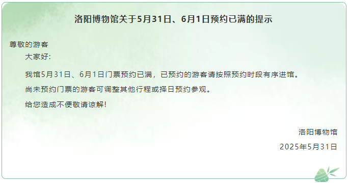洛陽(yáng)博物館關(guān)于5月31日、6月1日預(yù)約已滿的提示