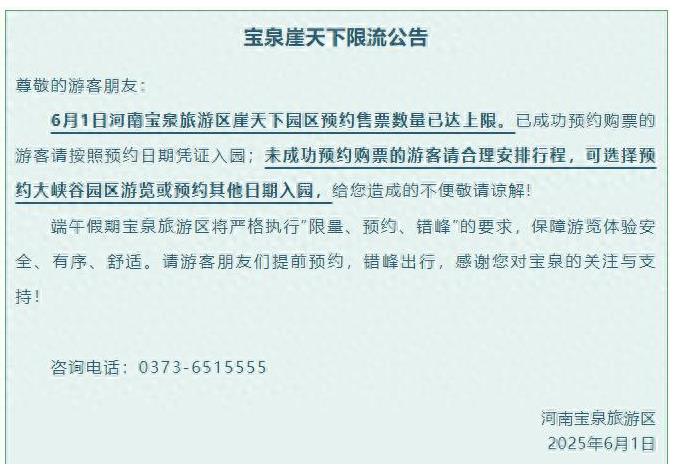 6月1日,記者從河南寶泉旅游區(qū)了解到,河南寶泉旅游區(qū)崖天下園區(qū)今天預約售票數(shù)量已達上限。已成功預約購票的游客請按照預約日期憑證入園;未成功預約購票的游客請合理安排行程,可選擇預約大峽谷園區(qū)游覽或預約其他日期入園。