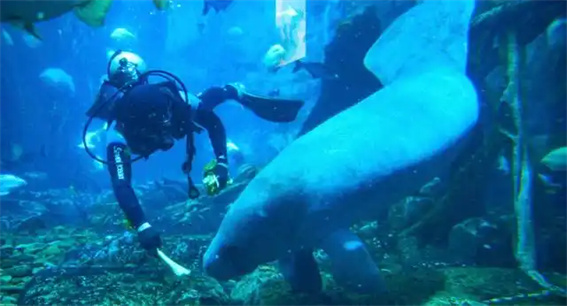 假期首日,首次露面的海洋家族新成員海牛兄弟“牛大”和“牛二”成為假期最受歡迎的海洋動(dòng)物之一。兩只海牛時(shí)而旋轉(zhuǎn)起舞,時(shí)而趴在角落里埋頭吃菜,時(shí)而游到展窗前和游客對(duì)望,圍觀的游客直夸“可愛(ài)”。