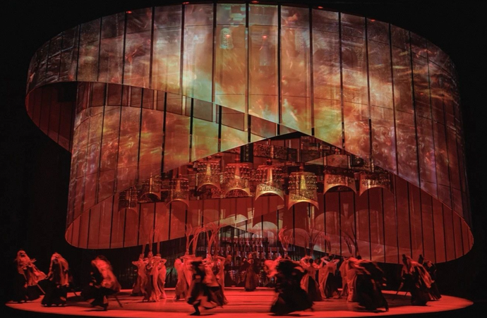 演出開始,竹簡如歷史長卷般緩緩展開、收縮,演員們穿梭其間,在精妙的燈光設(shè)計下,深紫色渲染出宮廷的神秘幽影,血紅色隱喻著戰(zhàn)爭的殘酷硝煙,隱約的綠意象征著和平的希望,層層鋪陳。結(jié)合環(huán)形舞臺360度旋轉(zhuǎn)與頂投、背投等多維度投影技術(shù),打造出時空交錯的蒙太奇效果,賦予觀眾獨特的“上帝視角”,使其完全沉浸于劇情之中,仿佛親身經(jīng)歷那段波瀾壯闊的歷史。