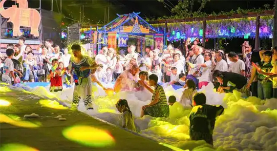 白天,游客可在空調(diào)開放的主題場館內(nèi),自在觀賞《海豚奇幻秀·豫見海洋》等王牌大秀,場館外還有夏水禮大巡游、水槍激戰(zhàn)、泡沫風(fēng)暴等互動演藝,帶來夏日清涼。夜幕降臨,海洋傣迪潑水狂歡、海洋機(jī)甲星光大巡游、璀璨星;ɑ鹦愕纫褂问⒀绯掷m(xù)上演,日夜不停盡享夏日狂歡熱潮。