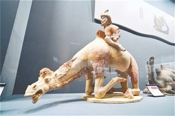 在“沙漠之舟”篇章,觀眾可以看到不同形態(tài)的駱駝俑及牽駝俑。這些駱駝俑不僅展示了駱駝作為“沙漠之舟”的重要地位,還生動(dòng)再現(xiàn)了絲路商隊(duì)穿越大漠的壯觀場景,體現(xiàn)了古代商旅的艱辛與勇氣?脊抛C據(jù)表明,駱駝的馴化始于公元前3000年左右,最早在阿拉伯半島,后逐漸傳播至中亞、北非等地區(qū)。到了漢唐時(shí)期,駱駝成為絲綢之路上不可或缺的交通運(yùn)輸工具,其性情溫順、不畏風(fēng)沙、耐饑耐渴的特性,使其能夠馱負(fù)著東西方文明的成果穿越蒼茫大漠。