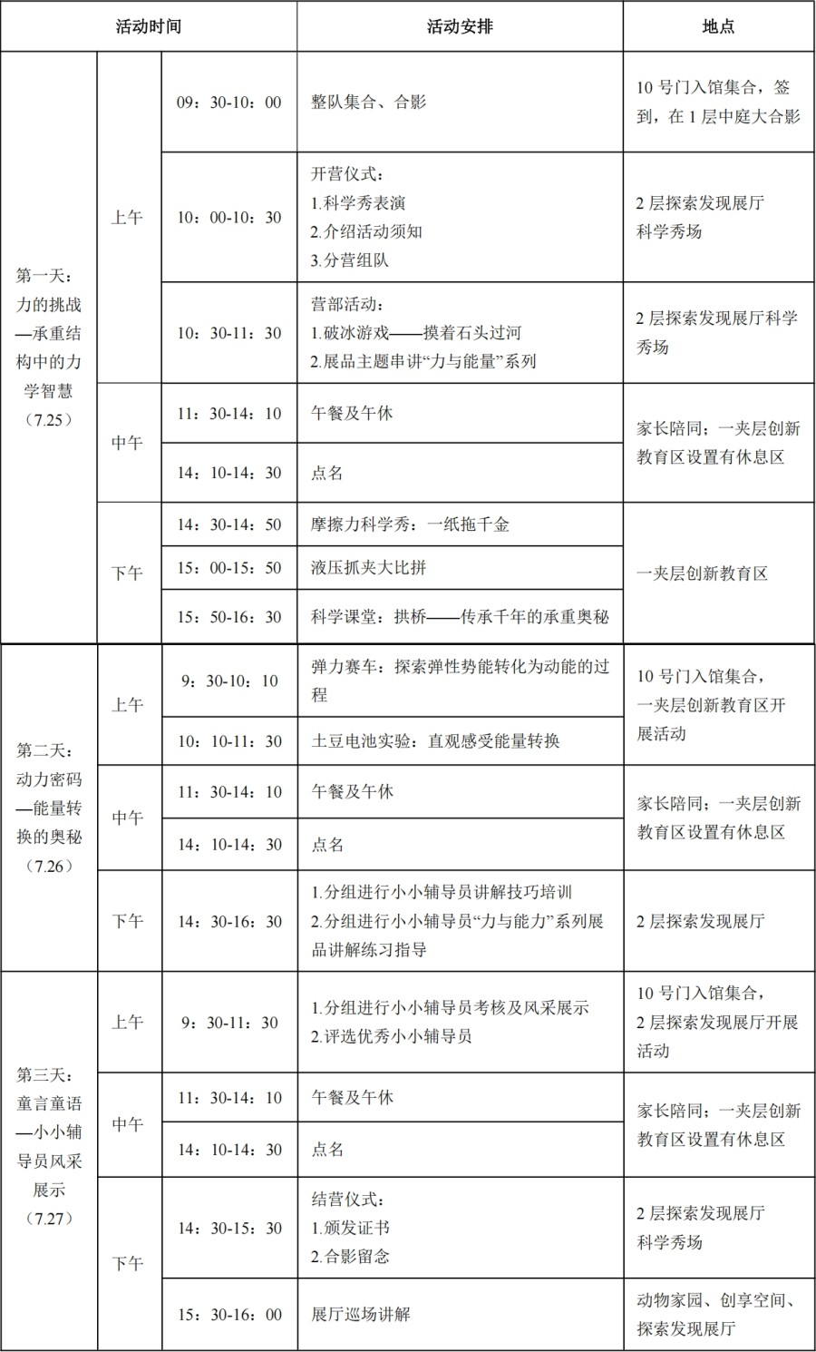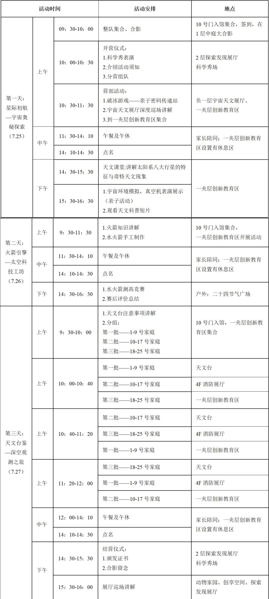 本次夏令營(yíng)活動(dòng)免費(fèi),共開(kāi)放50組家庭名額。一營(yíng)25組家庭面向公眾招募;二營(yíng)15組家庭面向省科技館館校合作校,10組家庭面向往屆“小小輔導(dǎo)員”招募。每組家庭限一個(gè)成人和一個(gè)兒童,餐飲費(fèi)用需參與家庭自理。