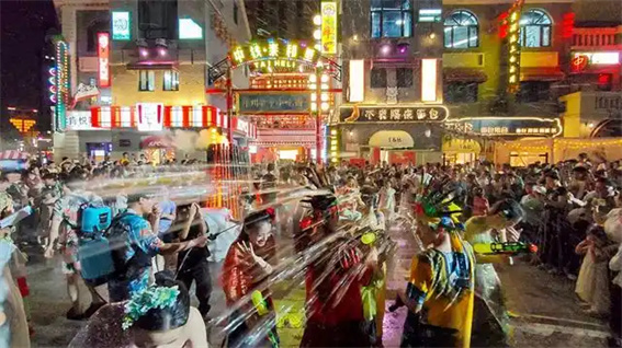 夜幕降臨,唐宋夢(mèng)華街區(qū)外廣場(chǎng)的“篝火蹦迪大會(huì)”化身為花漾潑水狂歡現(xiàn)場(chǎng),游客憑借泰和里專屬“交子幣”兌換的水槍,在NPC演員的帶領(lǐng)下,加入這個(gè)充滿活力的大型露天“戰(zhàn)場(chǎng)”,感受穿越時(shí)空的清涼狂歡。