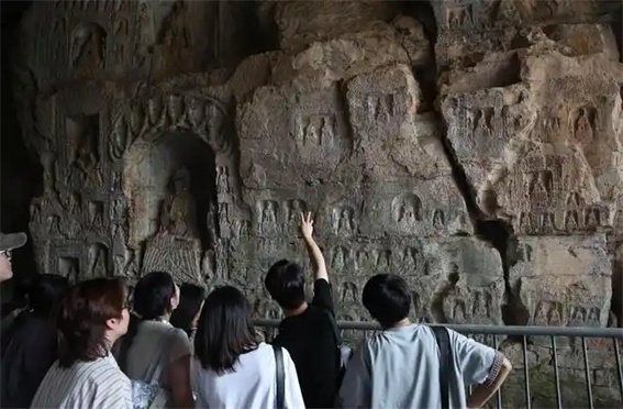 △ 7月16日,來自安徽的游客在水泉石窟內(nèi)參觀。