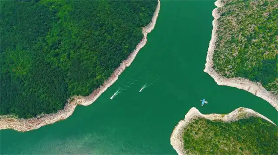 8月2日,游客乘船暢游于淅川縣丹江,行走于綠水青山之中,在藍(lán)天白云的掩映下,構(gòu)成了一幅美麗的夏日山水畫(huà)卷。