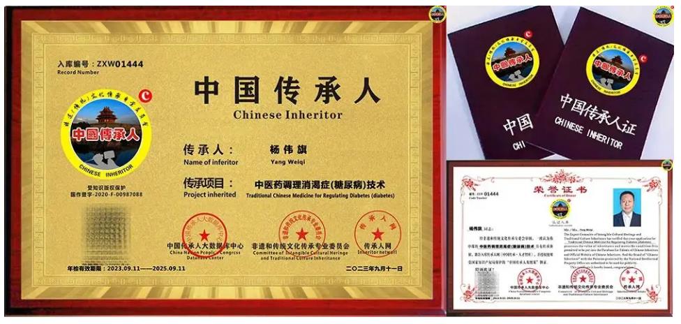 2023年9月,經(jīng)中國傳承人大數(shù)據(jù)庫中心非遺和傳統(tǒng)文化傳承專業(yè)委員會審核,認(rèn)為河南省開封市楊偉旗同志申報(bào)的“中醫(yī)藥調(diào)理消渴癥(糖尿病)技術(shù)”具有傳承價(jià)值,符合申報(bào)條件,準(zhǔn)許入庫傳承人網(wǎng)《中國傳承·人才智庫》,并授權(quán)使用受知識產(chǎn)權(quán)保護(hù)“中國傳承人及圖”牌證。