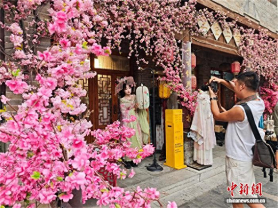 8月7日,正值暑期,河南洛陽(yáng)洛邑古城內(nèi)漢服熱持續(xù)升溫,吸引眾多游客身著古裝拍照打卡。圖為洛邑古城吸引游人拍照。王士豪 攝