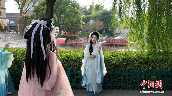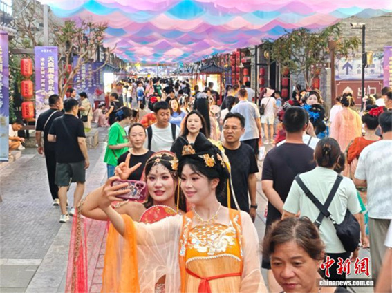 8月7日,正值暑期,河南洛陽(yáng)洛邑古城內(nèi)漢服熱持續(xù)升溫,吸引眾多游客身著古裝拍照打卡。圖為“天女散花”吸引眾多游客觀賞。王士豪 攝