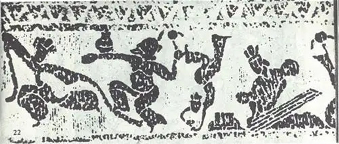 下層右側(cè)的“領(lǐng)隊(duì)”騎著馬扛旗前行,上層右側(cè)同樣有一個(gè)騎馬人,正向后轉(zhuǎn)身射箭。