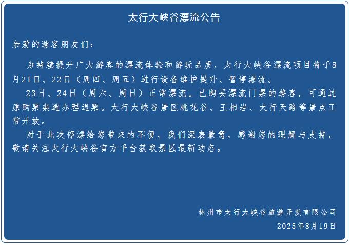太行大峽谷漂流公告