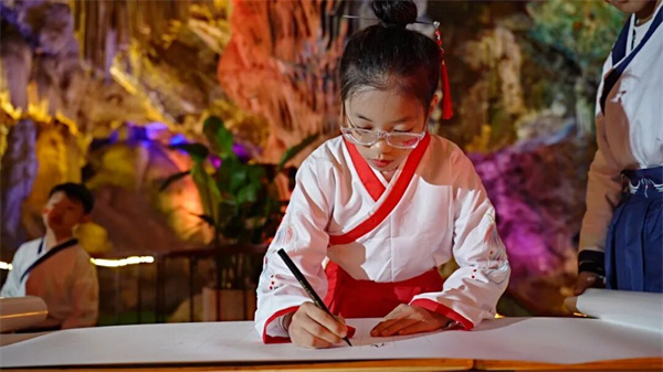 活動現(xiàn)場,小書法家們或揮毫潑墨,筆走龍蛇間盡顯少年意氣;或精雕細琢,一筆一劃中飽含赤子情深。墨香裊裊,與溶洞濕潤的氣息交織彌漫,為這場國慶慶典增添了獨特的文化意蘊。