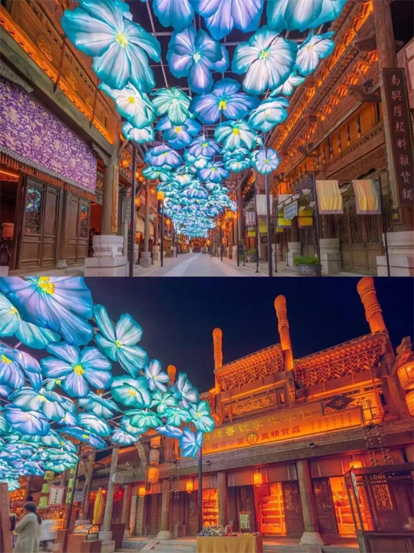 在【建業(yè)電影小鎮(zhèn)】,天光云影被朦朧的暮色溫柔接住,霓虹燈悄然亮起,為整條街蒙上一層復(fù)古的濾鏡。你與家人身著旗袍或長(zhǎng)衫,漫步于《穿越德化街》濕潤(rùn)的石板路上,仿佛走進(jìn)了老月的流光碎影里。遠(yuǎn)處,一彎月牙裝置靜靜置于前方,雖無(wú)朗月當(dāng)空,卻以另一種姿態(tài),呼應(yīng)著這個(gè)含蓄而深情的夜。