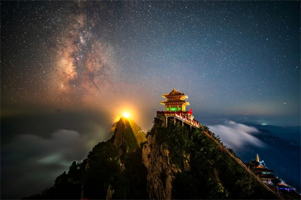 老君山在夜靜山空的夜晚,深邃的星空讓人為之沉醉,夜幕降臨,滿天的星斗和燈光交相輝映,變成了夜空的顏料和筆觸,勾勒出一幅幅迷人的夜色畫卷。