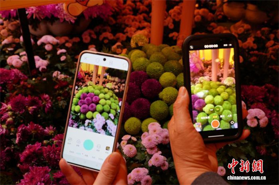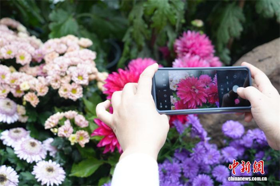 10月15日,開封清明上河園第十四屆國際菊花展正式開幕,選自中國、意大利、越南、馬來西亞等12個(gè)國家的數(shù)百萬株菊花品種,分別在“中國館”“歐洲館”“東南亞館”等8大展館進(jìn)行展出,吸引眾多游客前來拍照“打卡”。圖為游客通過手機(jī)與家人分享菊花美景。王士豪 攝