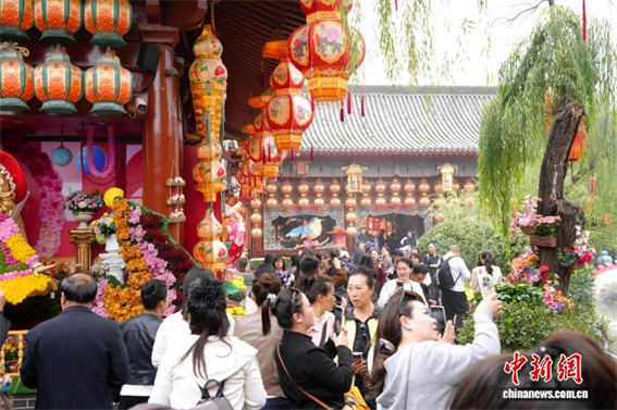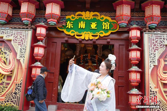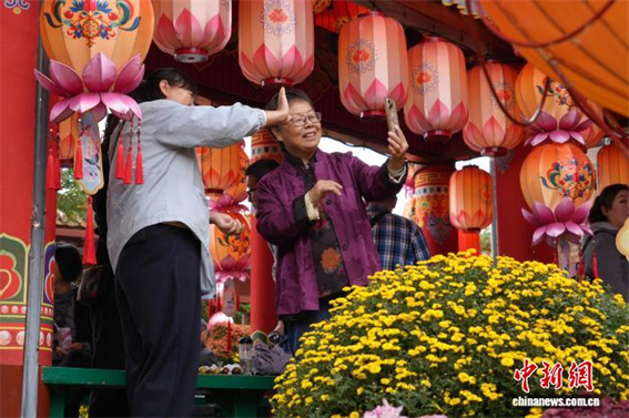 10月15日,開封清明上河園第十四屆國際菊花展正式開幕,選自中國、意大利、越南、馬來西亞等12個(gè)國家的數(shù)百萬株菊花品種,分別在“中國館”“歐洲館”“東南亞館”等8大展館進(jìn)行展出,吸引眾多游客前來拍照“打卡”。圖為身著古裝的游客在“東南亞館”前自拍。王士豪 攝