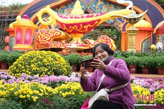 10月15日,開封清明上河園第十四屆國際菊花展正式開幕,選自中國、意大利、越南、馬來西亞等12個(gè)國家的數(shù)百萬株菊花品種,分別在“中國館”“歐洲館”“東南亞館”等8大展館進(jìn)行展出,吸引眾多游客前來拍照“打卡”。圖為游客在菊花前拍照自拍。王士豪 攝