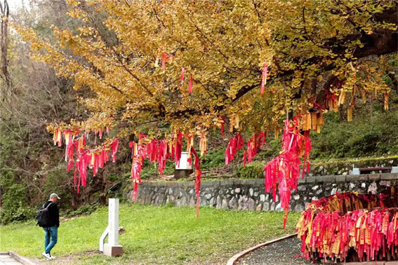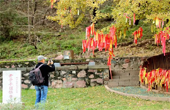 皸裂的樹皮紋理如歲月刻痕,粗糙卻滿含力量,與樹下輕擺的紅綢形成鮮明對(duì)比 —— 紅綢在鏡頭里化作流動(dòng)色塊,為蒼勁古木添上鮮活人文溫度。游客舉相機(jī)的身影,與古樹的偉岸形成趣味尺度對(duì)照,快門按下,便定格下人與樹、今與古的對(duì)話。
