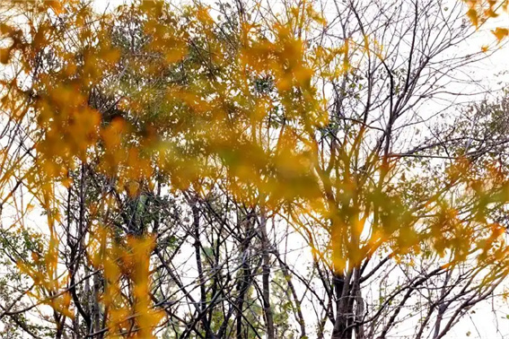深秋銀杏葉在光影里暈染得綠金漸變,每一片都似打磨的琥珀,逆光中透著剔透質(zhì)感,仿佛將兩千五百年陽(yáng)光鎖進(jìn)葉脈。俯瞰時(shí),古樹如金色云團(tuán)懸浮青山間,與古建、山路形成對(duì)稱構(gòu)圖,金黃樹冠在綠林映襯下,成為畫面最濃烈的視覺焦點(diǎn)。