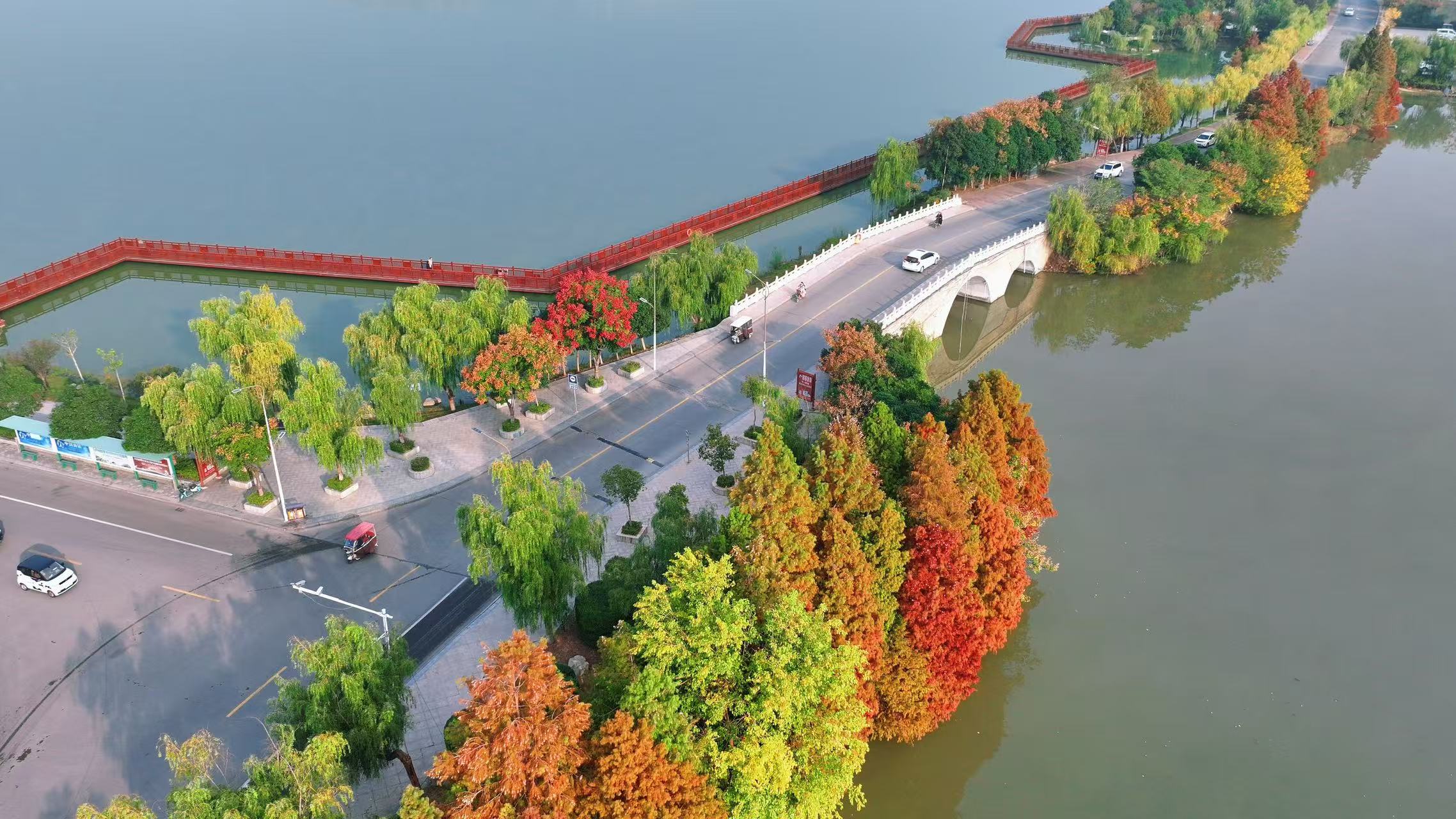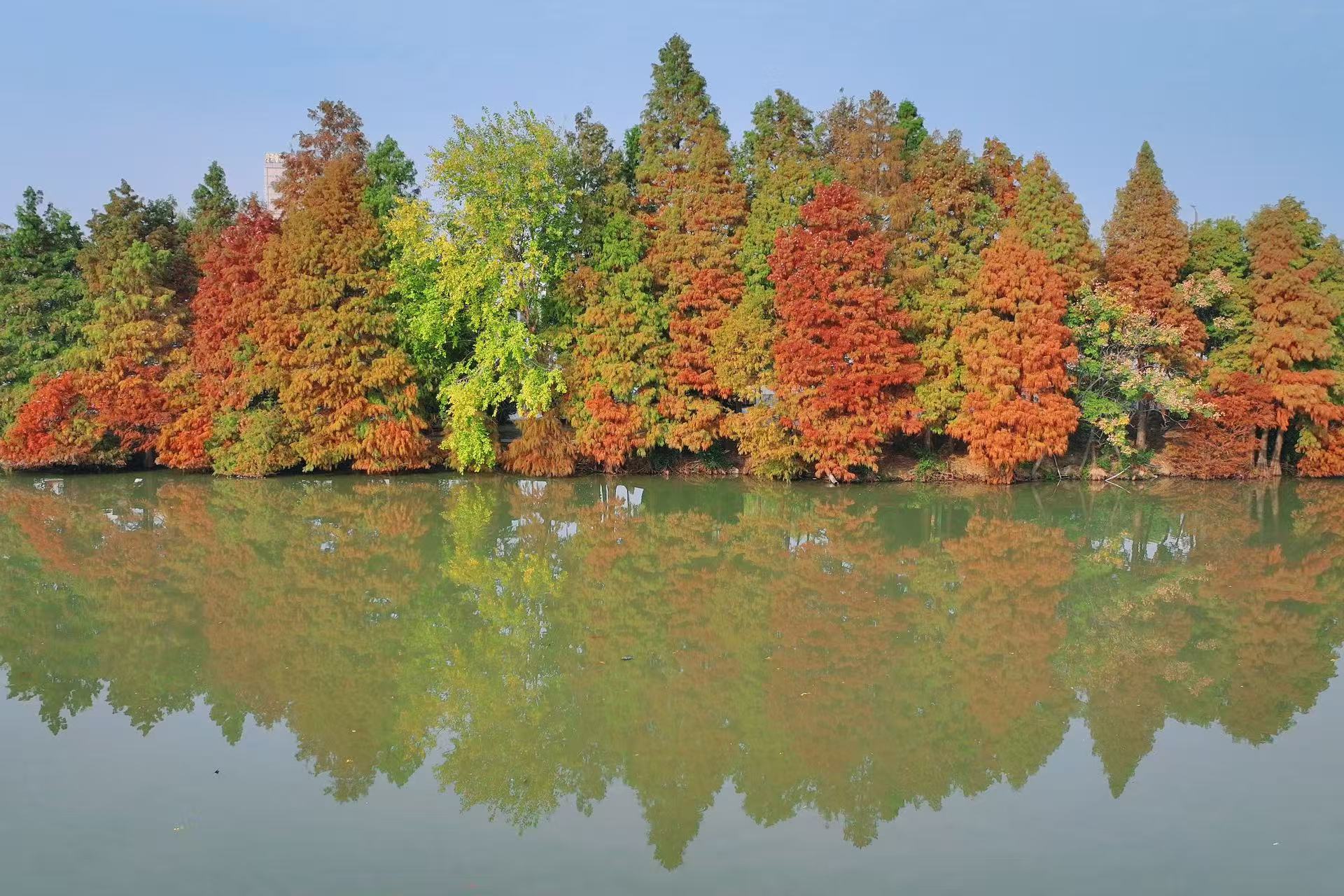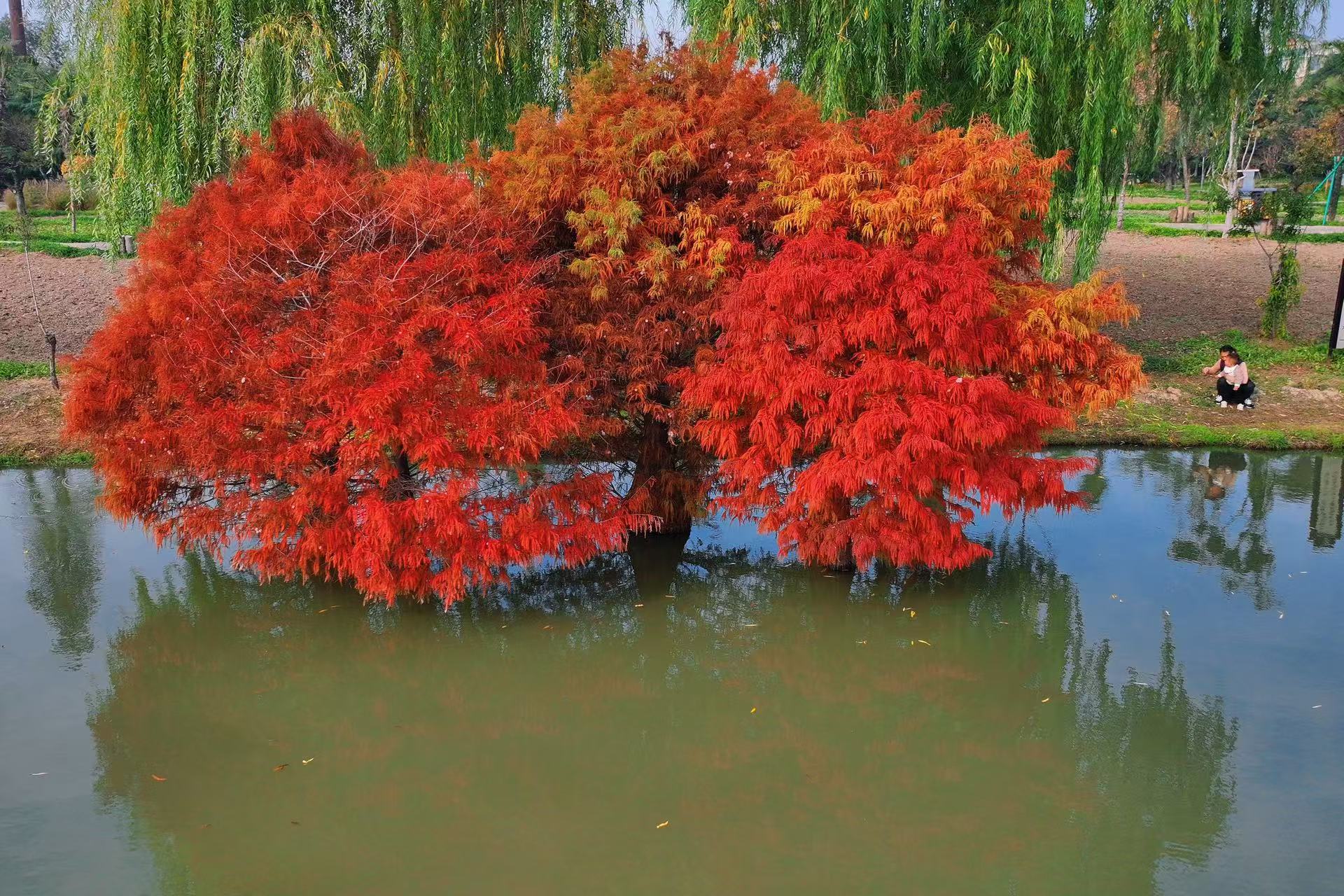 初冬時(shí)節(jié),柘城縣容湖國家濕地公園迎來了一年中最明艷的“盛裝時(shí)刻”:湖畔水杉林層林盡染,橙紅枝葉與澄澈湖水相映成趣,將這座城市公園暈染成一幅“碧水映紅杉,人在畫中游”的初冬畫卷,成為柘城及周邊市民周末休閑的熱門打卡地。
