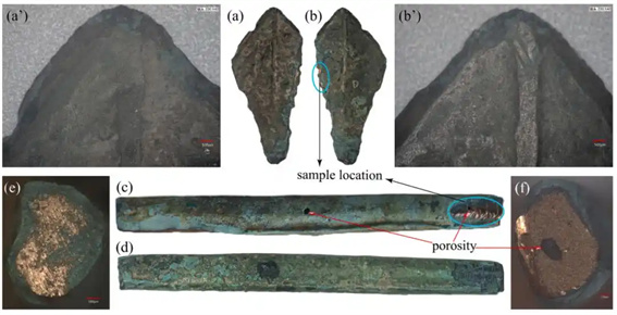 鄭州大學(xué)考古與文化遺產(chǎn)學(xué)院研究團(tuán)隊(duì)負(fù)責(zé)人介紹,團(tuán)隊(duì)通過(guò)金相檢驗(yàn)、微區(qū)成分分析、元素分析等方法確認(rèn),兩件器物均為銅錫鉛三元合金鑄造而成。較多的雜質(zhì)元素與疏松多孔的質(zhì)地,表明原料應(yīng)是直接使用多金屬共生礦冶煉而成,反映出早期冶金技術(shù)的原始特征。目前,相關(guān)研究成果已在線發(fā)表于國(guó)際學(xué)術(shù)期刊Archaeological Research in Asia。