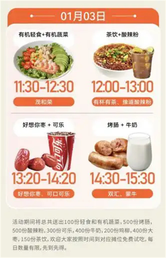 逛累了?雙匯、好想你、豫道酸辣粉、蒙牛、可口可樂、有杯有茶、茂和榮、堅(jiān)芽樂堅(jiān)果等知名品牌將在特定時(shí)段提供免費(fèi)試吃,打造舌尖上的驚喜時(shí)刻,具體時(shí)段請(qǐng)留意現(xiàn)場(chǎng)公告。