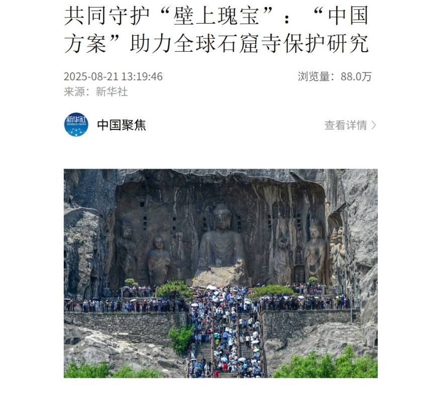 新華社推出多篇重磅報道,其中《智繪中國・世遺鏡鑒|數(shù)字技術讓龍門石窟“芳華永駐”》深度揭秘石窟數(shù)字化保護成果,通過超精建模、數(shù)字復位等技術手段,讓千年紋飾實現(xiàn)“數(shù)字永生”;《共同守護“壁上瑰寶”:“中國方案” 助力全球石窟寺保護研究》則聚焦2025石窟寺保護國際論壇,向世界傳遞中國石窟保護的先進經(jīng)驗。