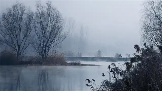 1月8日清晨,站在林州市五龍鎮(zhèn)荷花村村西遠眺,薄霧如紗纏繞河道兩岸,蘆葦和樹冠覆著細碎霜花,小橋上偶有行人穿過......目之所及皆為留白,宛若水墨仙境。