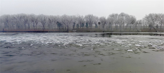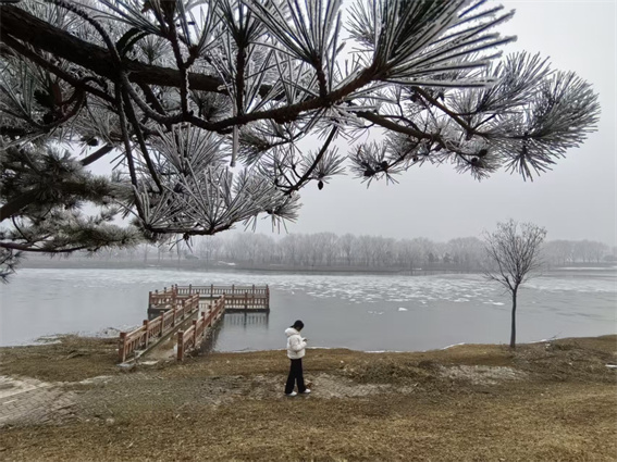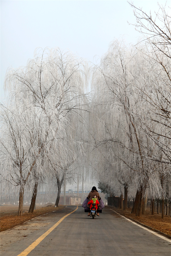 河水的冰面之上,蒙著一層如夢(mèng)似幻的薄霧,遠(yuǎn)處的岸線與天空漸漸交融,化作一片淡灰色的柔和絨幕。偶爾,有人裹著厚實(shí)的棉服緩緩走過(guò),在霜地上踩出一串淺淺的腳印,那腳印,宛如給冬日這張素白的信箋,輕輕蓋下了一枚溫軟而獨(dú)特的印章。還有人騎著電動(dòng)車從霧凇掩映的林間小道緩緩駛過(guò),那鮮艷的紅棉襖,在一片白茫茫的世界里顯得格外奪目,仿佛是這素凈冬日畫卷中最鮮活、最靈動(dòng)的注腳——這,便是溫縣的冬,冷得清透純粹,卻又在寒冷之中包裹著人間煙火的融融暖意。