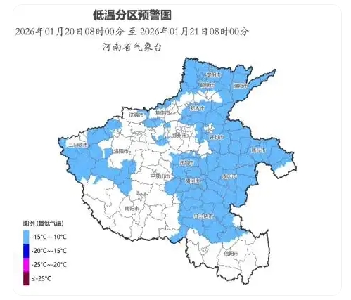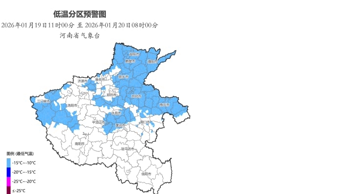 河南省氣象臺2026年1月19日11時00分發(fā)布低溫藍色預(yù)警:預(yù)計20日凌晨,黃河以北大部、三門峽、洛陽南部、鄭州東部和南部、開封、商丘、周口北部、許昌、漯河、平頂山東南部部分縣(市、區(qū))最低氣溫降至零下12℃到零下10℃。
