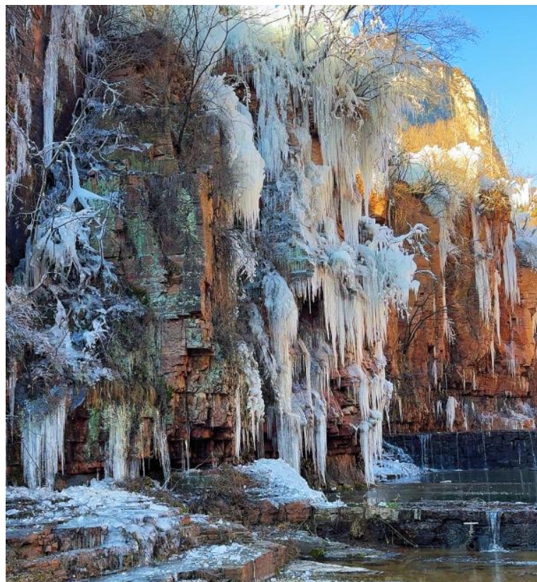 冰瀑奇觀區(qū):太行絕壁間冰瀑垂掛如簾,晶瑩剔透的冰掛在陽光下閃爍著耀眼光芒,漫步其間,每一步都仿佛踏入夢(mèng)幻的冰雪童話世界。