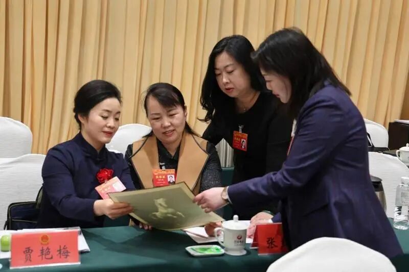 省十四屆人大四次會(huì)議期間,賈艷梅(左一)向其他代表展示她帶來(lái)的馬年主題剪紙作品。 融媒體記者 屠良冀 攝