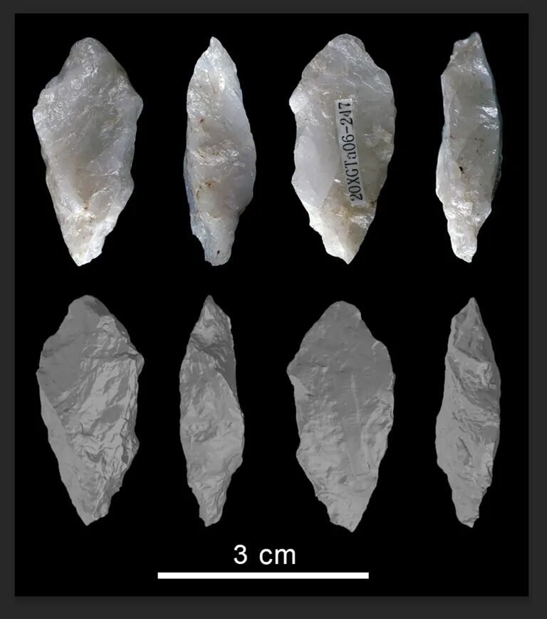作為本次研究的核心實(shí)證來源,西溝遺址出土的2601件石制品涵蓋刮削器、鉆器等多種類型,其中22件基部修理工具經(jīng)微痕分析確認(rèn)存在明確裝柄痕跡,證實(shí)至少有兩種柄部連接方式,這是東亞目前最早、經(jīng)雙重佐證的復(fù)合工具實(shí)例,均來自西溝遺址的考古遺存。